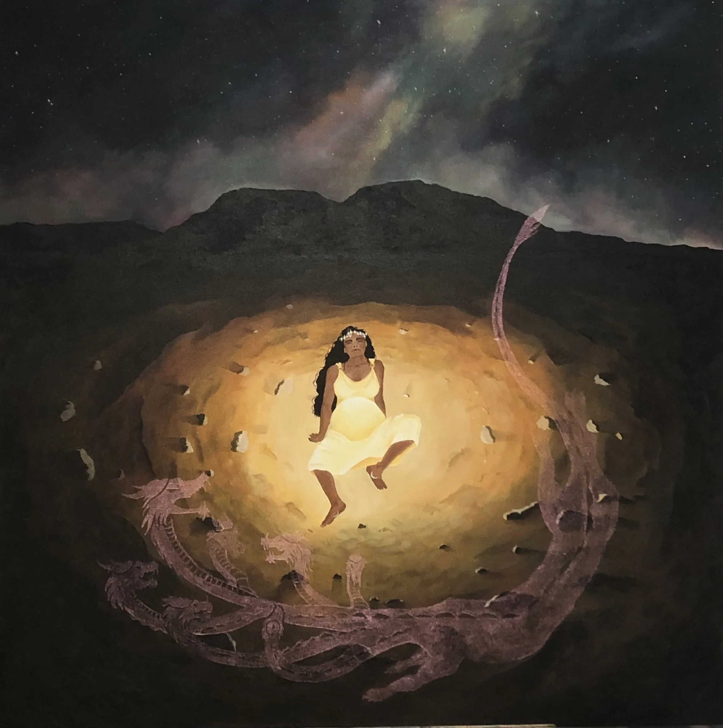 In September of 2024, I went to bed thinking there was no way Iād be interested in the open call about the years of the snake and dragon. My dreams had other ideas. I dreamt of a pregnant mother glowing with light in a barren desert being circled by a dragon as the milky way lit the sky overhead. I dreamt of a deadly snake hurtling through the stormy clouds towards earth, beautiful and deadly. When I awoke, I recognized the imagery from the biblical apocalypse text of Revelation. So naturally I had to paint them.